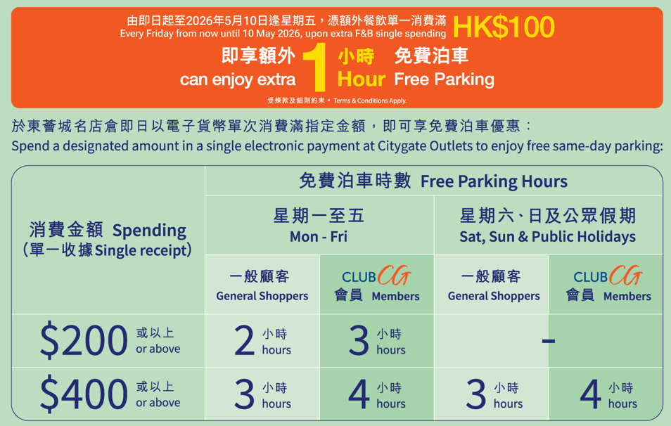 CLUB CG members can redeem a Citygate Outlets 1-Hour Free Parking Coupon for 800 Points, which can be used instantly to enjoy an extra hour of free parking!