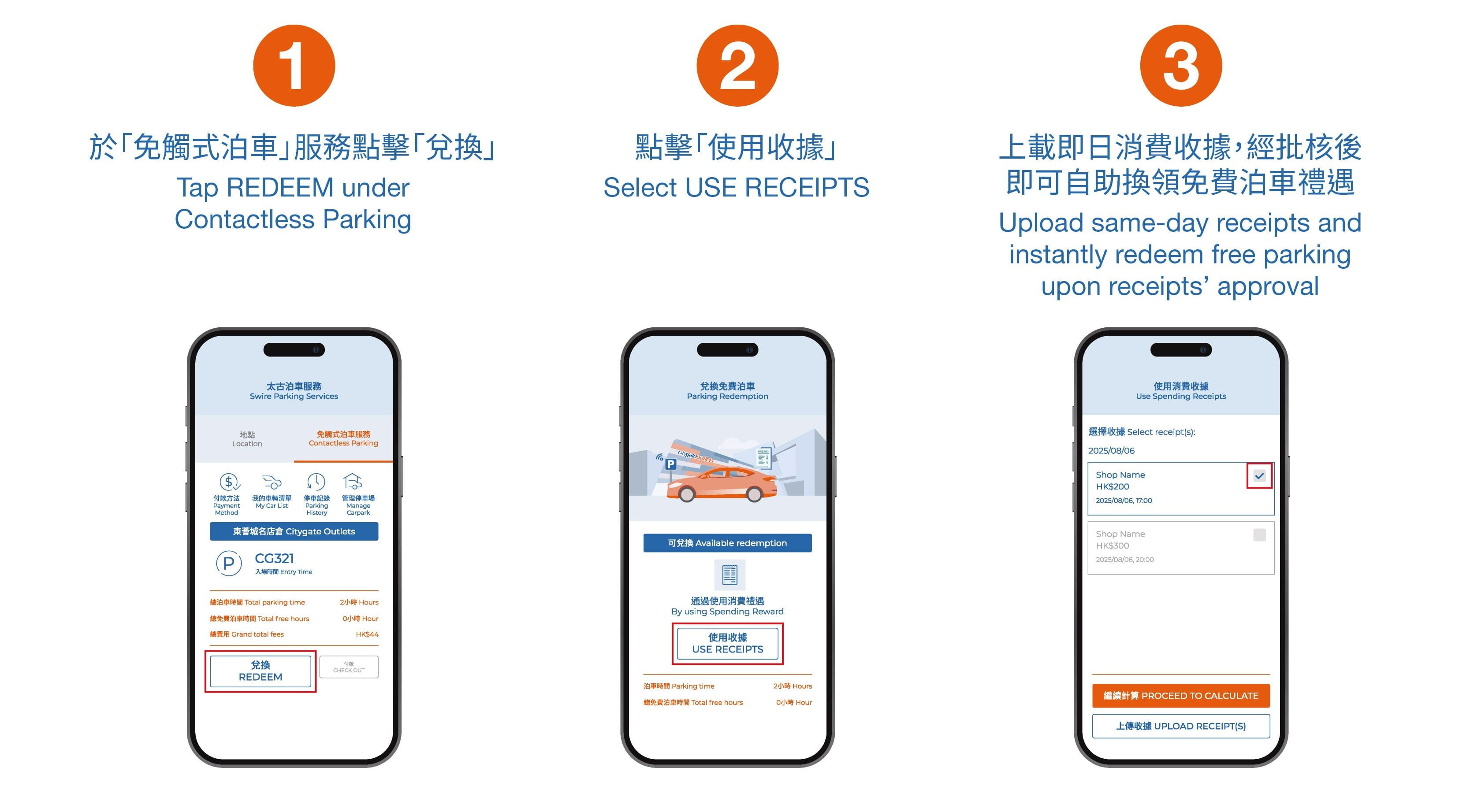 免觸式泊車服務現已推出全新功能, CLUB CG正式會員只需於TAIKOO+流動程式內上載合資格即日消費單據^,即可自助換領免費泊車禮遇*!